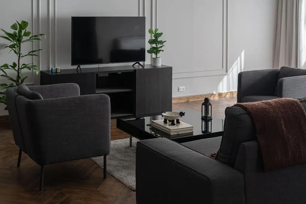 With a sofa set and a work desk, Ultra-Modern 4Br In Maadi Degla Apartment offers amenities such as a flat-screen TV with satellite channels, an iron with ironing board, and comforts like climate control. A bidet, a bathtub, and a separate toilet are also featured in the bathroom.